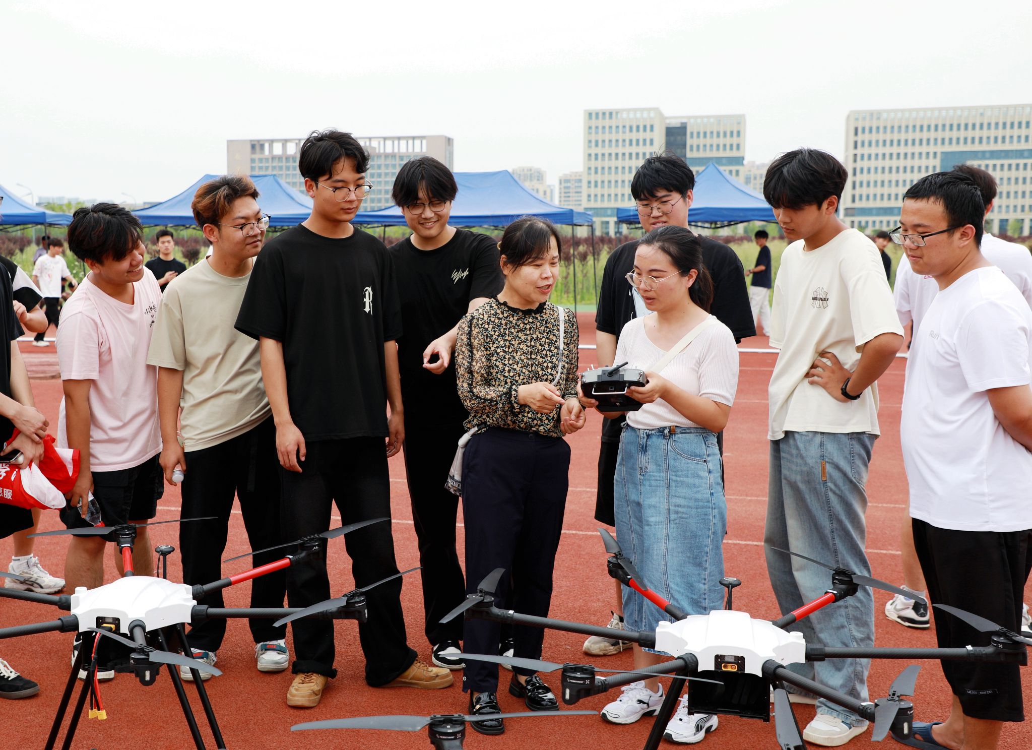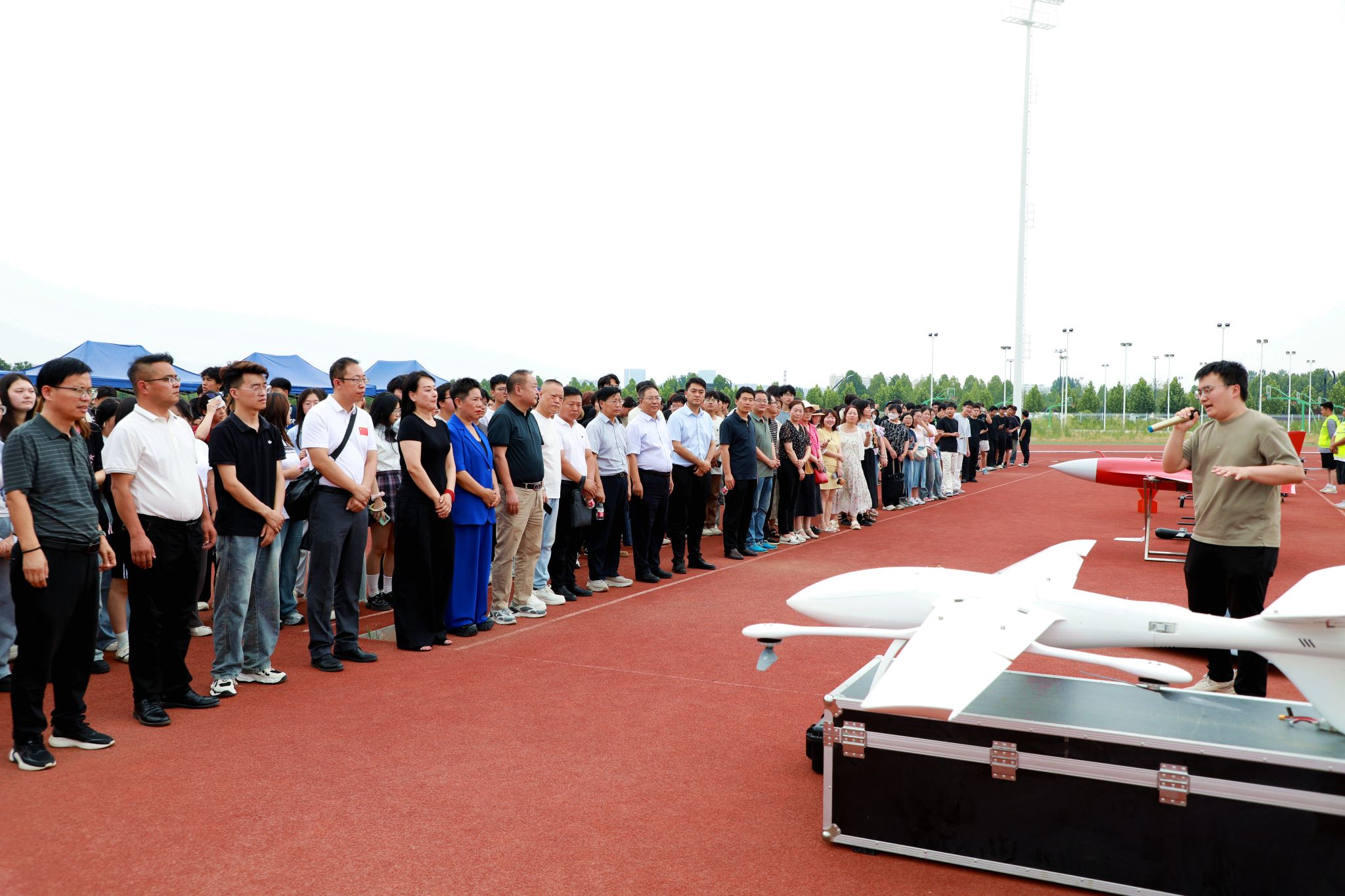 无人机展览与科技实践展示环节,现场展示了垂起G32、集群×8、植保直机、照明机、抛投机等机型,现场中型训练机、喊话机进行了飞行表演。无人机在空中灵活穿梭,尽显测绘科技魅力,激发了广大师生的浓厚兴趣,大家纷纷尝试体验,真切感受测绘科技的飞速发展与创新。