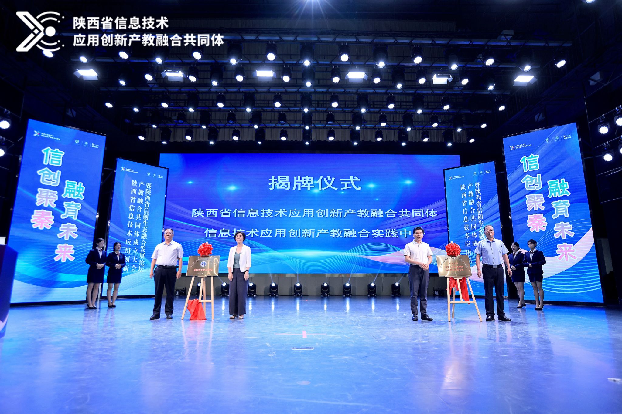 大会选举产生了第一届理事会领导机构,聘请了第一届共同体专家。相关领导为特聘专家颁发聘书,为理事长单位、副理事长单位、常务理事单位代表授牌,为陕西省信息技术应用创新产教融合共同体、信息技术应用创新产教融合实践中心揭牌。