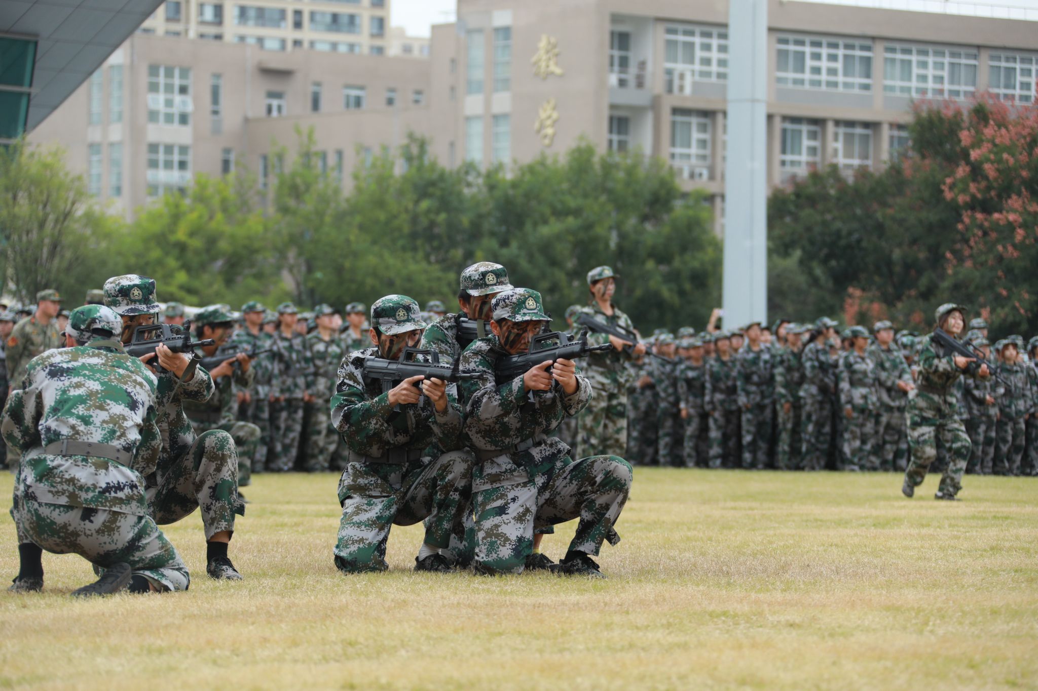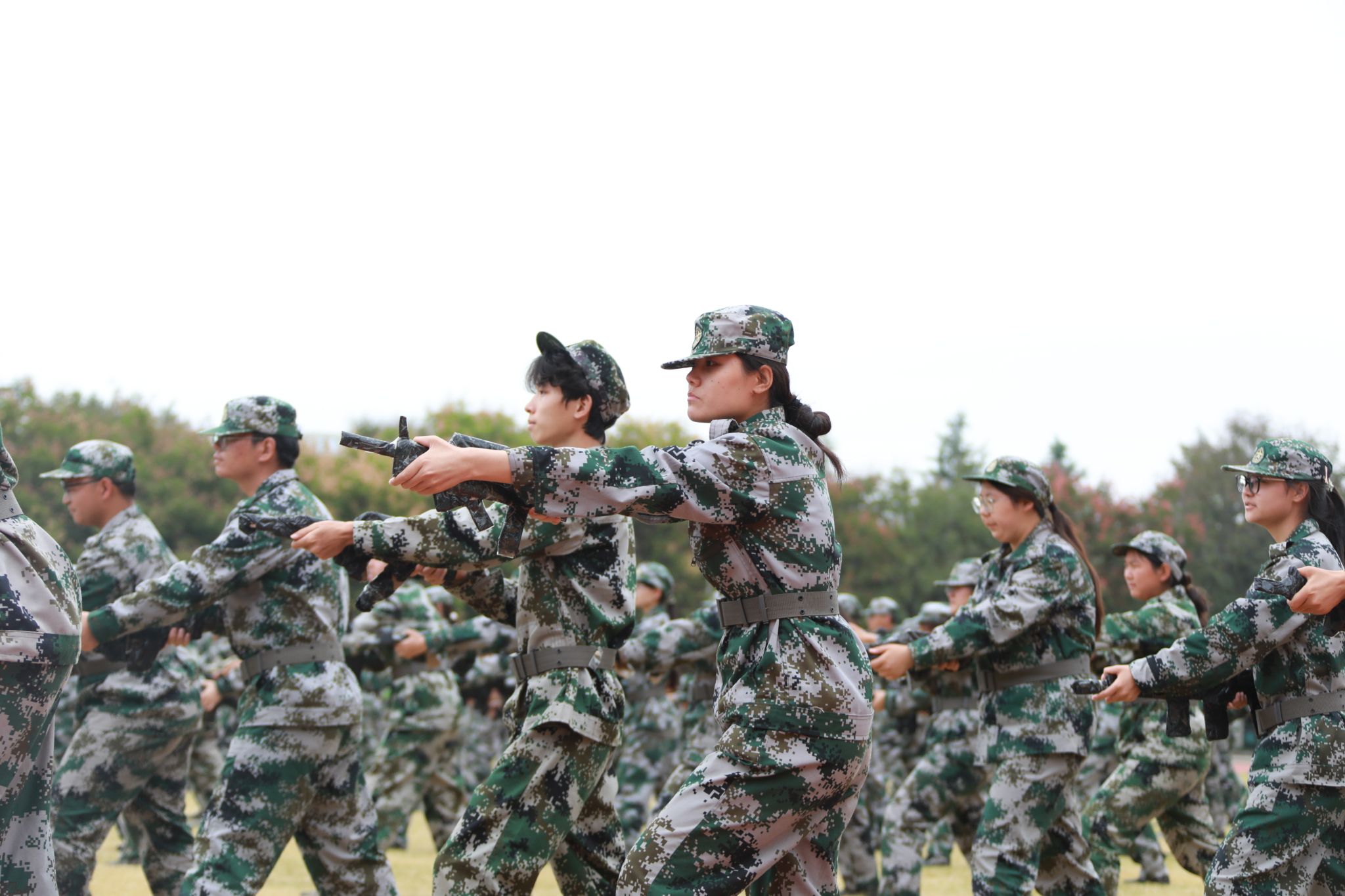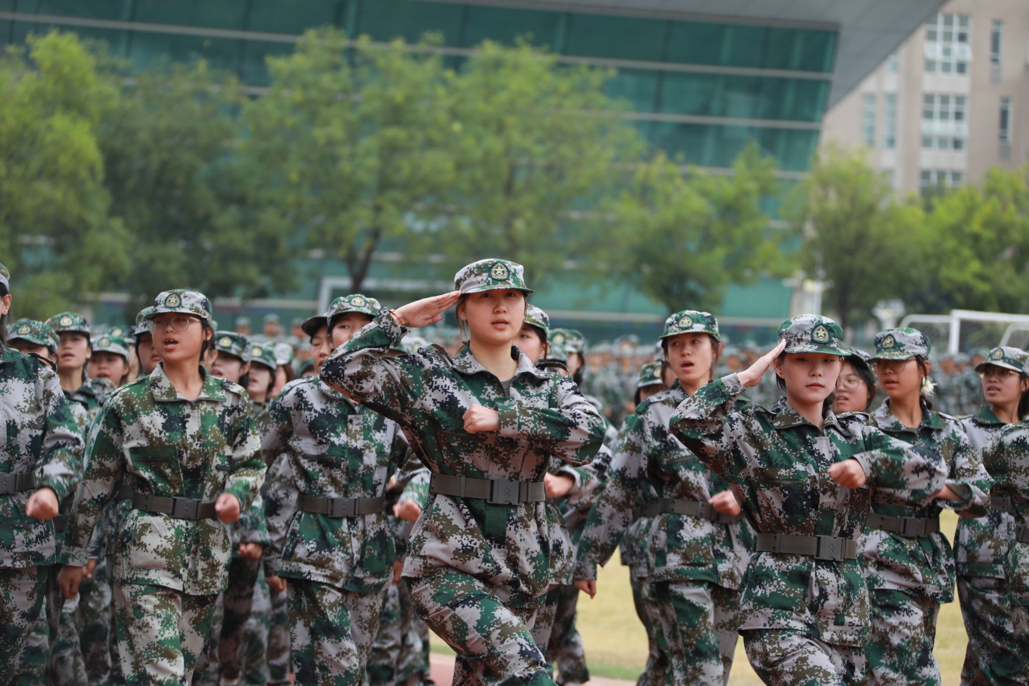 上午9时,典礼在雄壮的国歌声中拉开帷幕。伴随着激昂的《分列式进行曲》,十个军训方阵依次通过主席台接受检阅。同学们步伐铿锵、目光如炬,挺拔的军姿、整齐的队列,展现出咸职学子精益求精的训练成果和昂扬向上的青春斗志。军事课目汇报表演精彩纷呈,队列行动整齐划一,彰显团结协作力量;刺杀操口号震天,气势如虹,突显作战训练硬核素养;战术演练紧张逼真,搜索、匍匐、狙击等动作连贯精准,体现单兵技能与团队协同的深度融合;军体拳刚劲有力、捕俘刀迅猛凌厉,一招一式尽显青春豪情与战斗作风。整个展示过程节奏紧凑、气势昂扬,赢得了现场师生阵阵掌声。