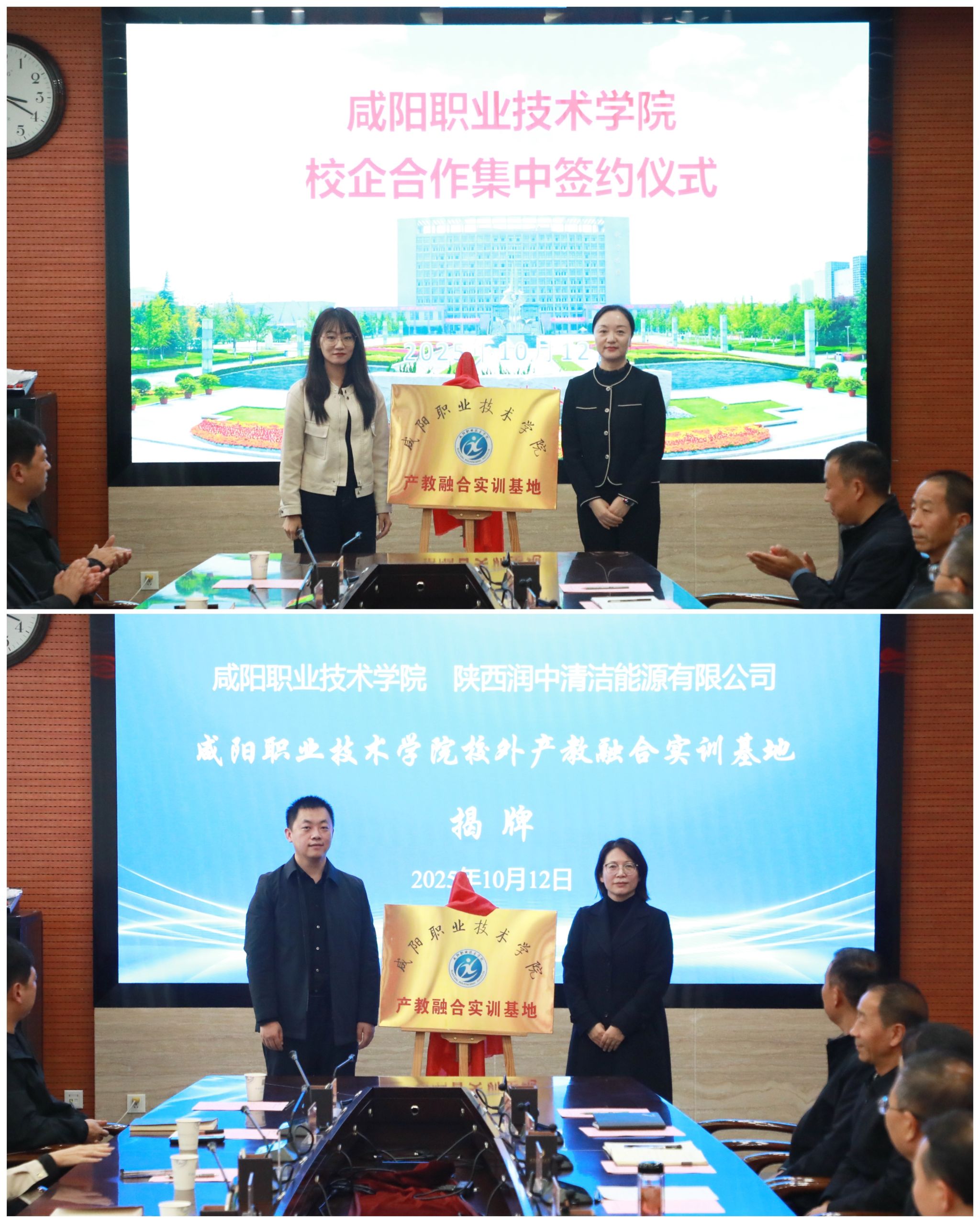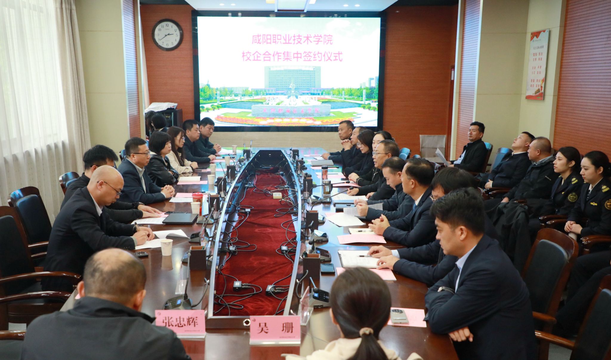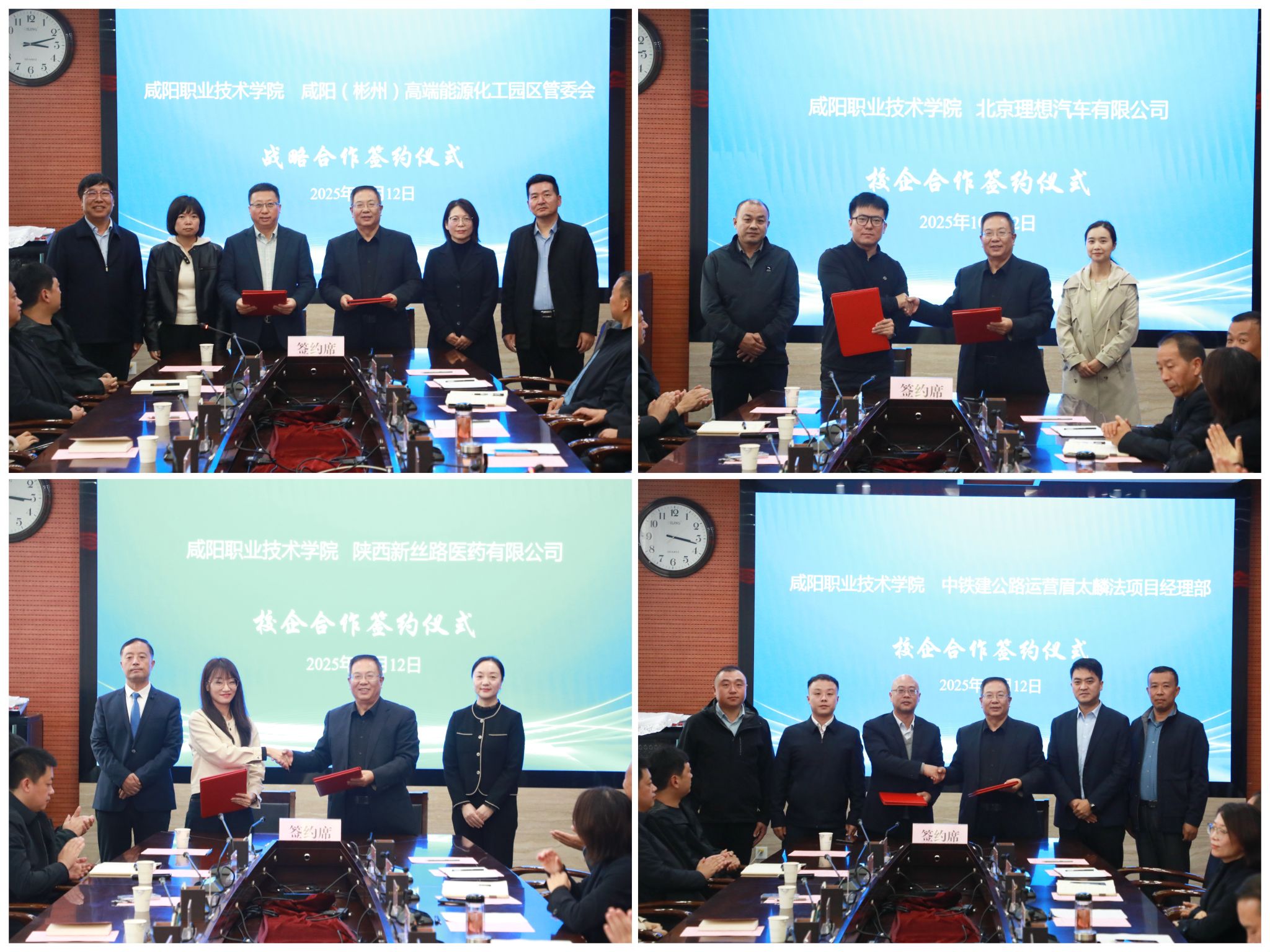 在与会嘉宾和二级学院的共同见证下,咸阳(彬州)高端能源化工园区管委会、北京理想汽车有限公司、陕西新丝路医药有限公司、中铁建公路运营有限公司等政企代表依次上台签约。