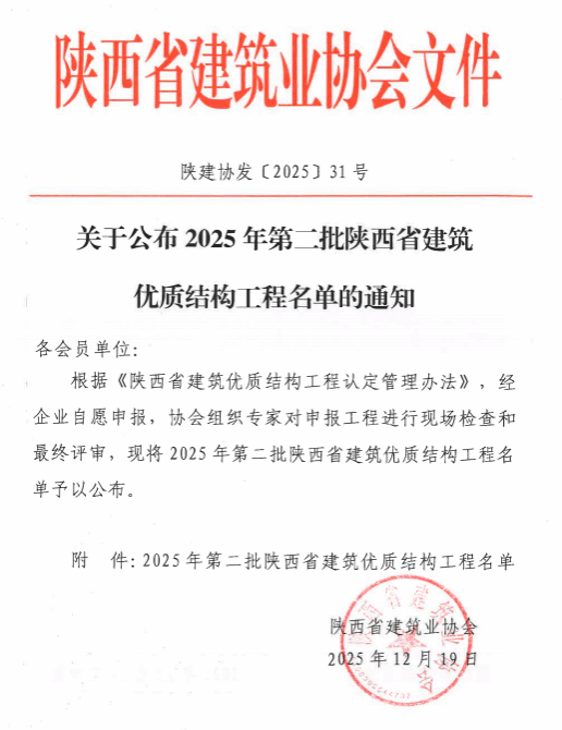 近日,陕西省建筑业协会公布了“2025年第二批陕西省建筑优质结构工程”名单,米兰milan官方网站12#学生公寓项目被评为2025年“陕西省建筑优质结构工程”。