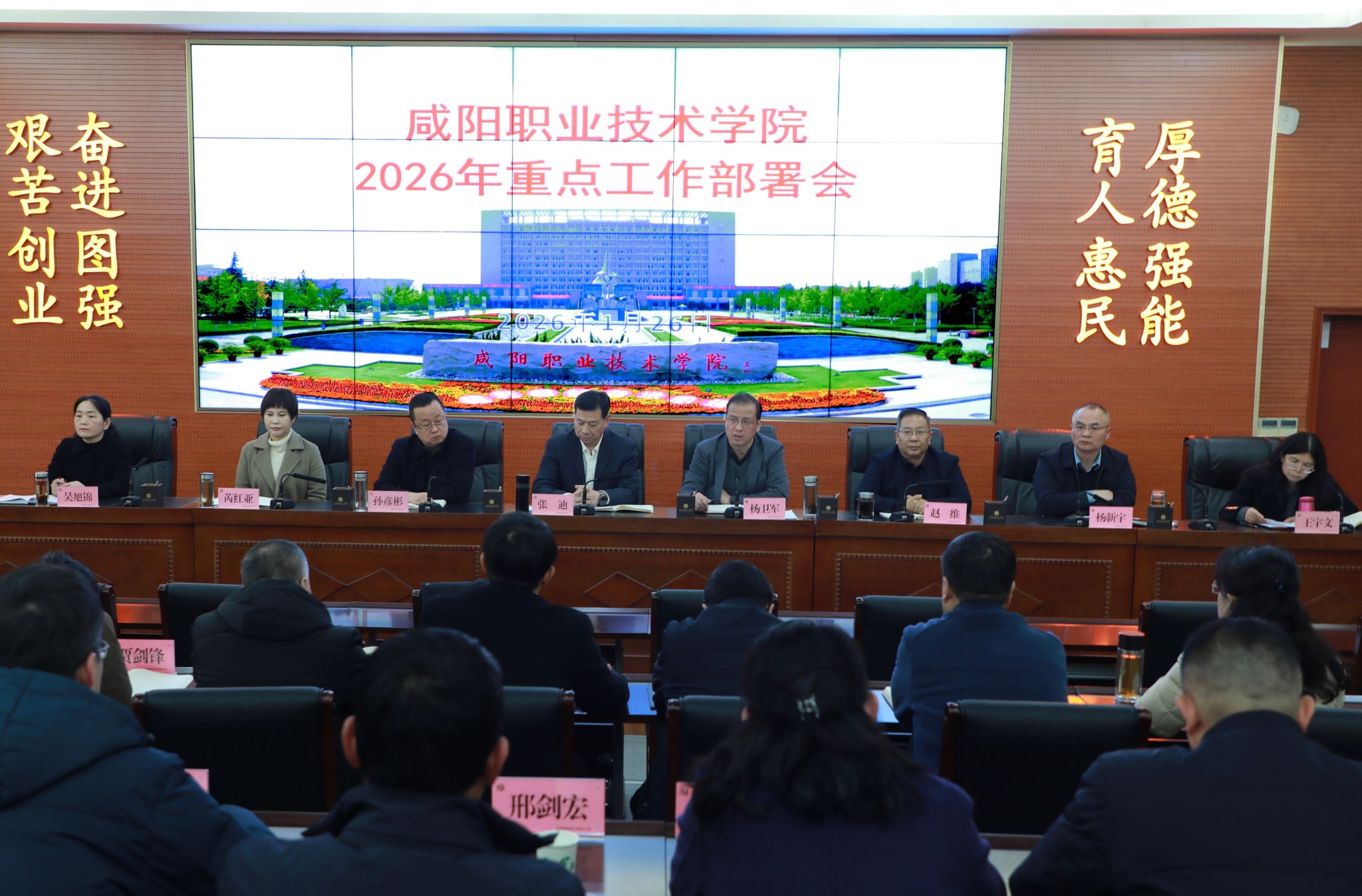 杨卫军在讲话中,就学院2026年的重点工作提出明确要求。一要全力推进创建职教本科工作,将其作为学院提升办学层次的核心目标,凝聚共识,对标对表,精准发力。二要深化第二期“双高”建设,聚焦标志性成果培育,强化内涵建设,确保建设任务高质量完成。三要抓实办学能力评价工作,以评促建、以评促改,全面客观展现学院办学实绩与发展成效。四要扎实做好招生工作,创新宣传方式,优化生源结构,为学院可持续发展奠定坚实基础。五要做好就业工作,拓宽就业渠道,为毕业生搭建优质就业平台。