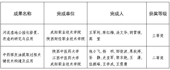 王军利教授主持完成的《河流湿地公园化修复、改造的研究与应用》获优秀成果三等奖;果秋婷副教授参与完成的《中药挥发油提取过程关键技术构建及应用》获优秀成果二等奖。