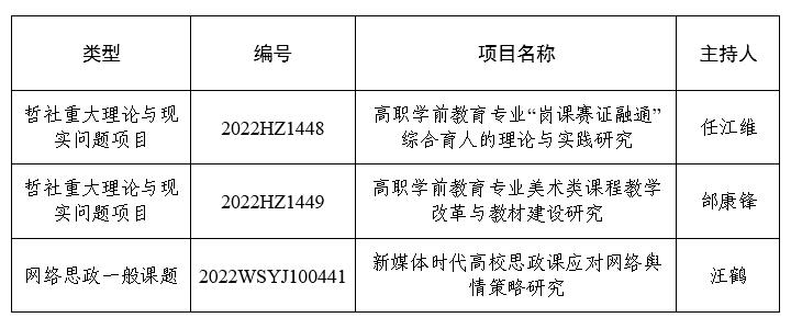 任江维老师主持的《高职学前教育专业“岗课赛证融通”综合育人的理论与实践研究》(2022HZ1448),通过对高职学前教育专业“岗课赛证融通”综合育人体系进行研究,为高职学前教育专业改革创新人才培养模式、提高人才培养质量提供路径参考。