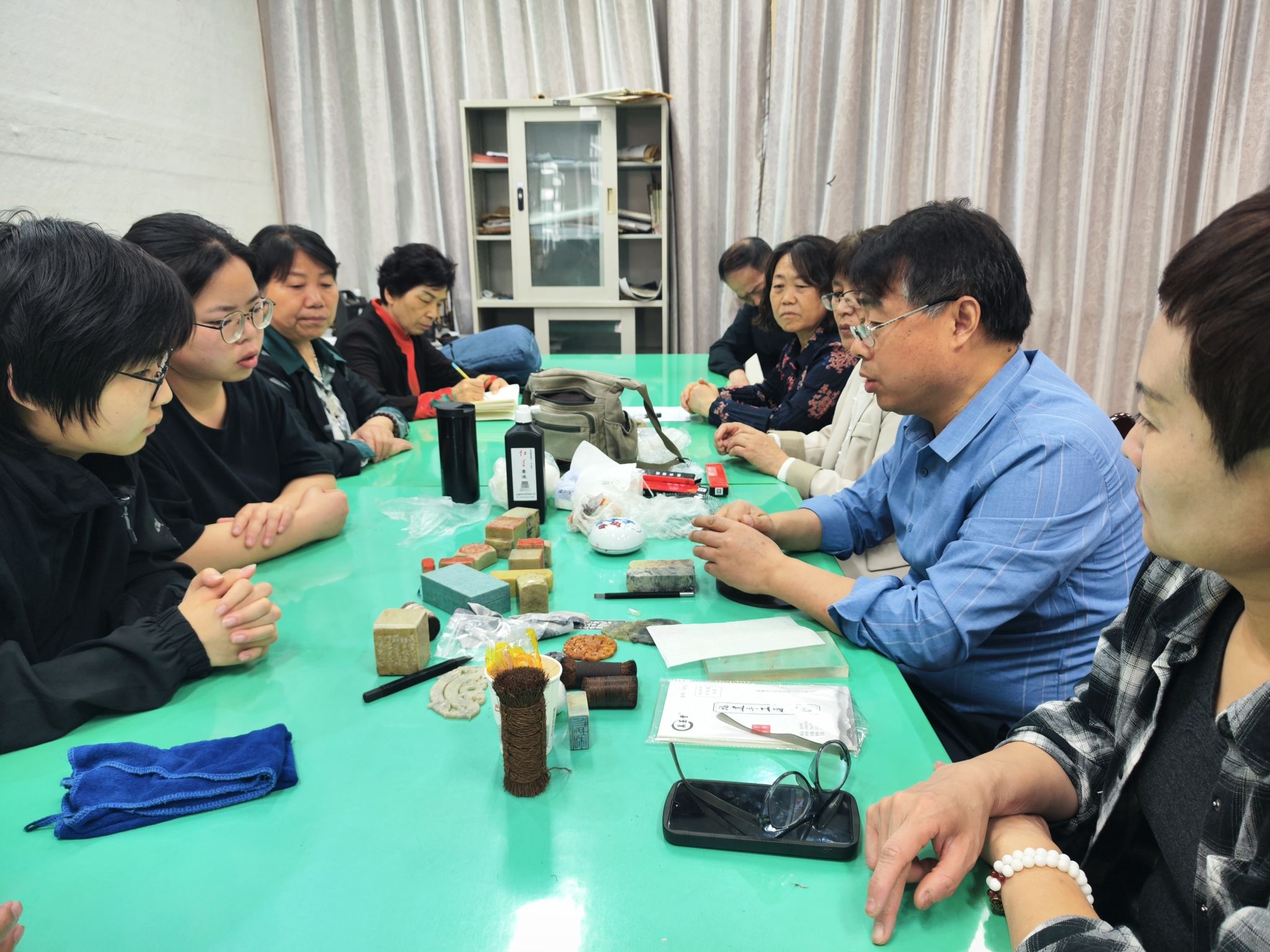 学院教师文晓东介绍了中国篆刻艺术的发展历史和基本知识。以实际操作训练为主,系统地开展了篆刻钤印、刻边款、边款拓印、印屏制作等环节的教学示范,整个教学环节专业规范、深入浅出,直观醒目,操作性强,使参与者全面了解了篆刻艺术的技法。参与成员兴趣浓厚,热情高涨,一致表示充分感受到了中国篆刻艺术的独特魅力,收获颇丰。