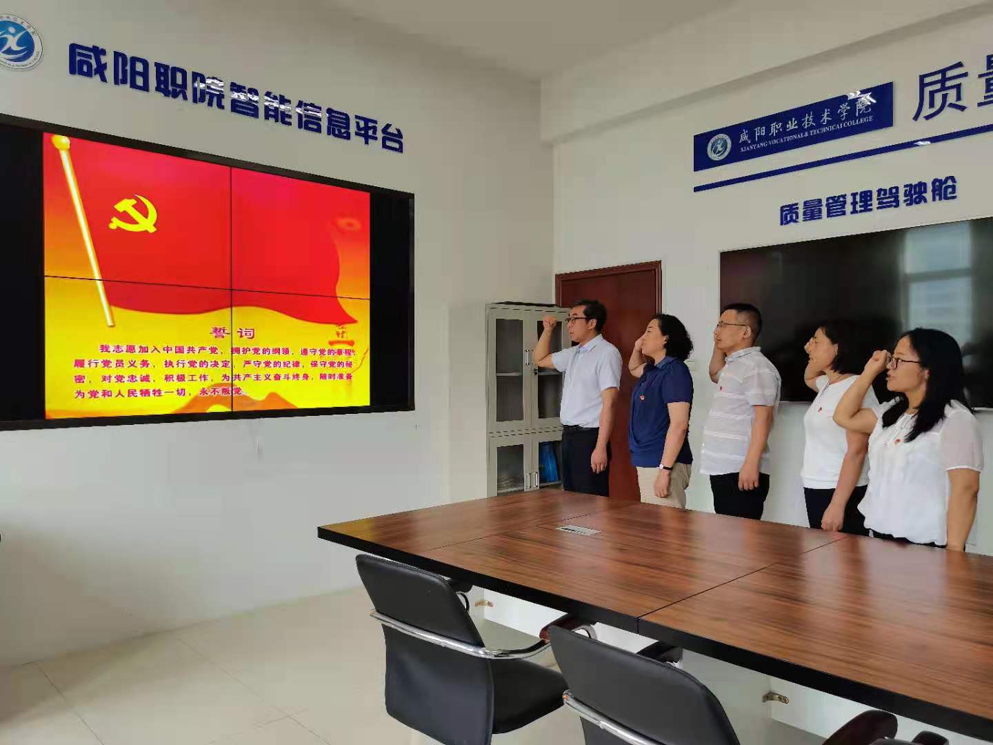会后,实训中心党支部全体党员,聚集在党旗下,庄严宣誓:我志愿加入中国共产党,拥护党的纲领,遵守党的章程,履行党员义务,执行党的决定,严守党的纪律,保守党的秘密,对党忠诚,积极工作,为共产主义奋斗终身,随时准备为党和人民牺牲一切,永不叛党!并齐声高唱“没有共产党就没有新中国”。