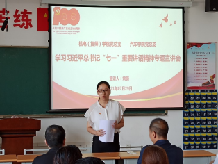 7月29日上午,机电学院党总支和汽车学院党总支在教学楼201教室举行学习贯彻习近平总书记“七一”重要讲话精神专题宣讲报告会,特邀院党委宣讲团姚薇老师作专题宣讲。会议由汽车学院党总支书记张兆斌同志主持,两个学院全体党员参加。